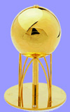 This is the largest light quantum generator for indoor use, which Ingeborg Reden ever designed. The top of the globe carries a stone in brilliant cut. Another stone of this kind is attached to the floor plate. This apparatus is made from massive brass. It is plated with 24-ct. highly polished hard gold (as all indoor equipment by Ingeborg Reden is). The light energy globe should be aligned in a North-South axis. The Maltese cross (engraved on the globe) has to be positioned "in line" with the stone on the floor plate (The globe can be adjusted and then re-tightened by loosening a screw in the ground plate).
